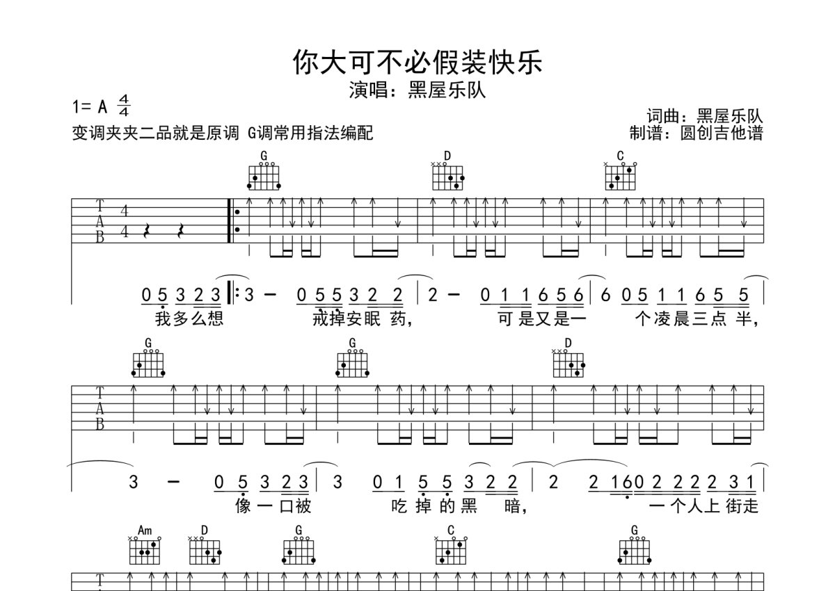 黑屋乐队《你大可不必假装快乐》吉他谱 - G调弹唱六线谱