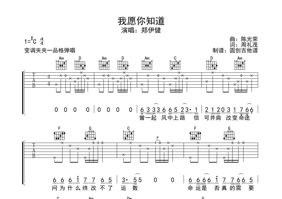郑伊健《我愿你知道》吉他谱 - C调弹唱六线谱