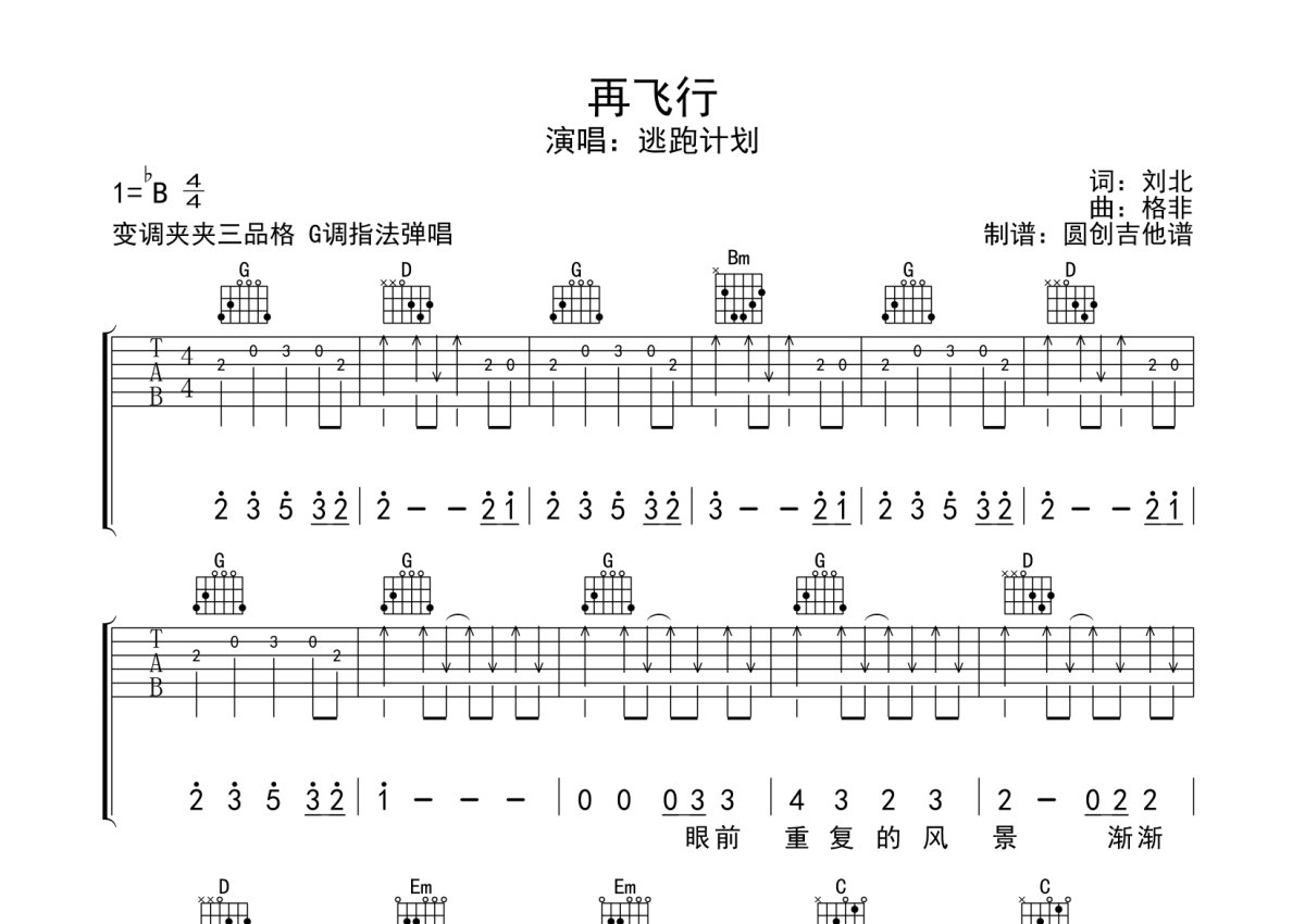 逃跑计划《再飞行》吉他谱 - G调弹唱六线谱