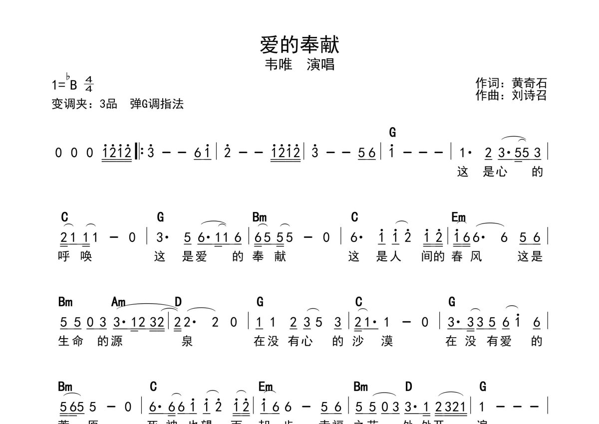 《爱的奉献》是韦唯演唱的一首歌曲,带和弦级数,拍号为4/4拍,这份简谱共有一张高清图谱,图谱由 @静沐暖阳 编配上传。