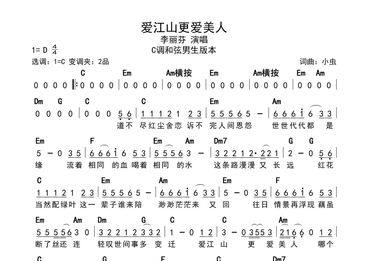 《爱江山更爱美人》是李丽芬演唱的一首歌曲,带和弦级数,拍号为4/4拍,这份简谱共有一张高清图谱,图谱由 @静沐暖阳 编配上传。