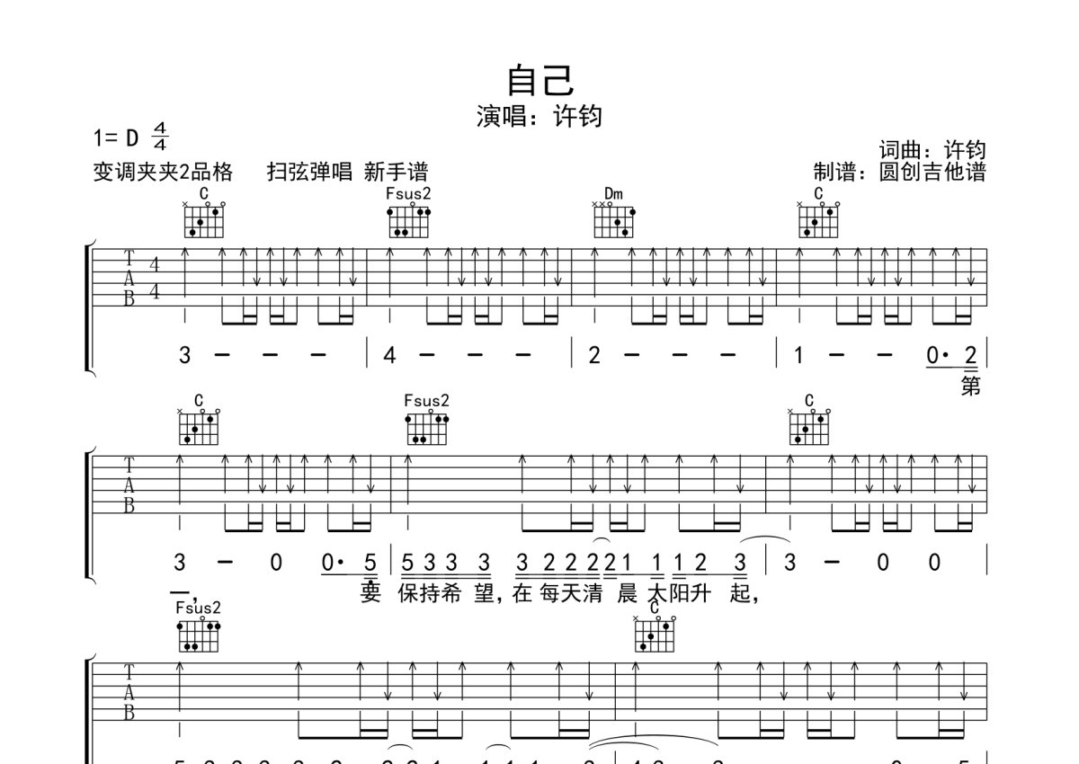 许钧《自己》吉他谱 - C调弹唱六线谱