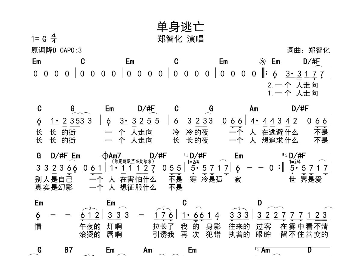 郑智化《单身逃亡》简谱 - 带和弦级数