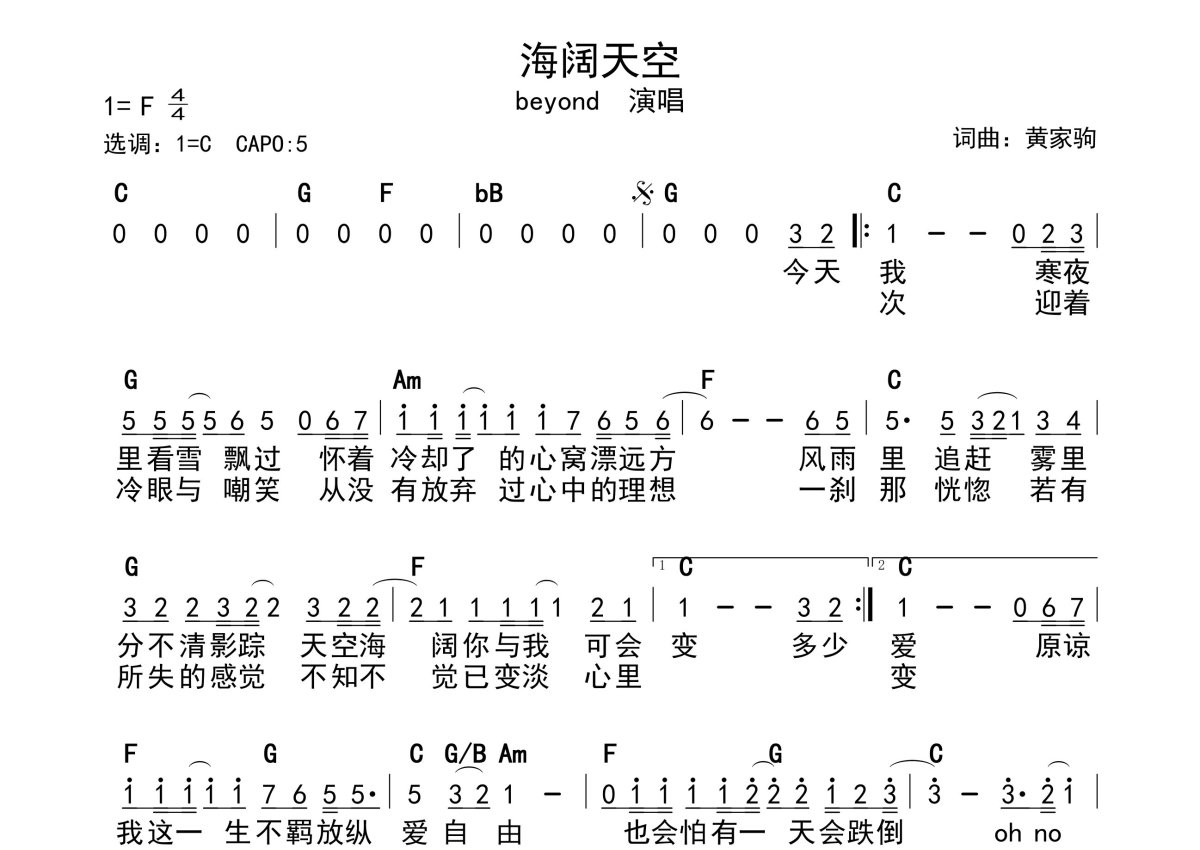 《海阔天空》是Beyond演唱的一首歌曲,带和弦级数,拍号为4/4拍,这份简谱共有一张高清图谱,图谱由 @静沐暖阳 编配上传。