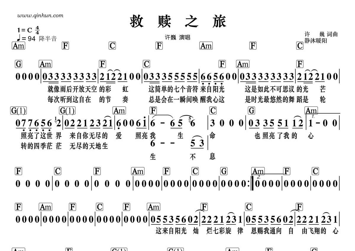 《救赎之旅》是许巍演唱的一首歌曲,带和弦级数,拍号为4/4拍,歌曲速度为每分钟94拍,这份简谱共有一张高清图谱,图谱由 @静沐暖阳 编配上传。