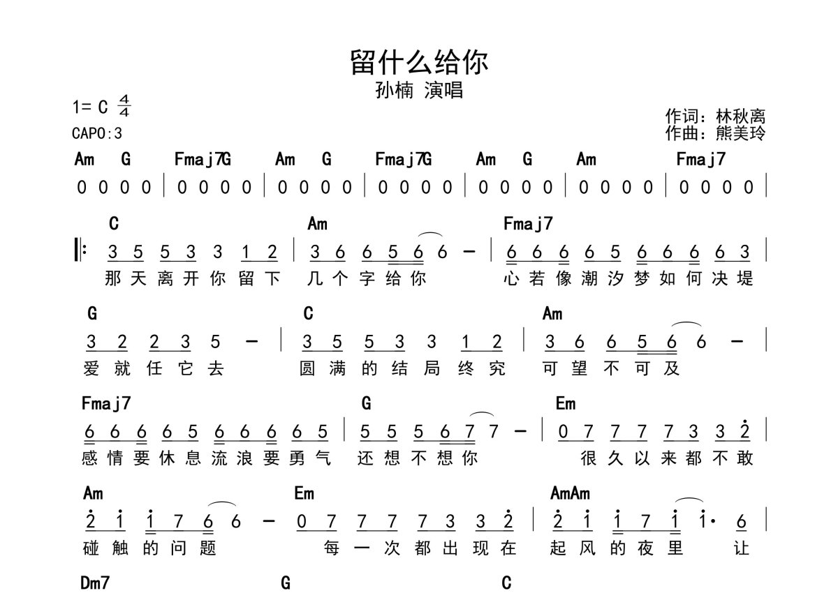 《留什么给你》是孙楠演唱的一首歌曲,带和弦级数,拍号为4/4拍,这份简谱共有一张高清图谱,图谱由 @静沐暖阳 编配上传。