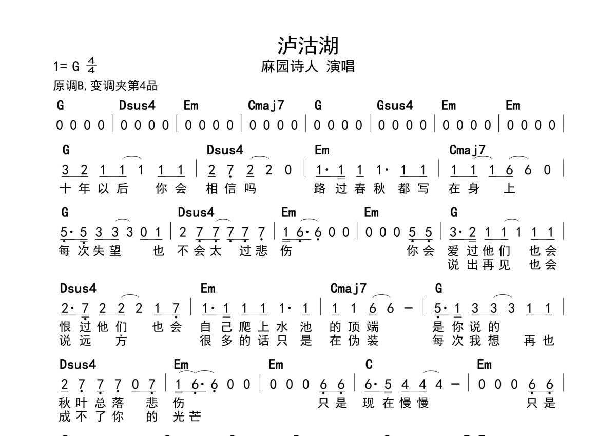 《泸沽湖》是麻园诗人演唱的一首歌曲,带和弦级数,拍号为4/4拍,这份简谱共有一张高清图谱,图谱由 @静沐暖阳 编配上传。