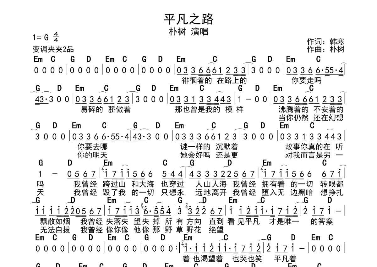 朴树《平凡之路》简谱 - 带和弦级数