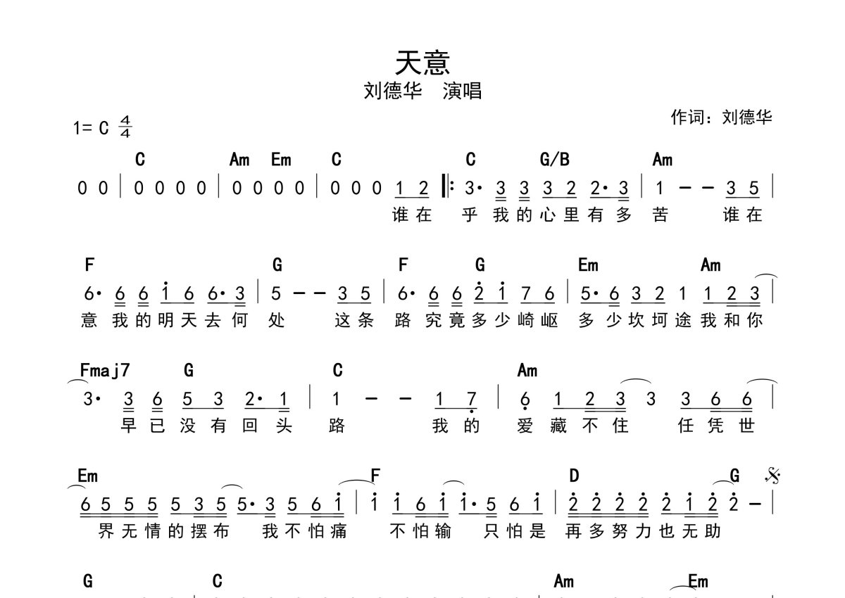 《天意》是刘德华演唱的一首歌曲,带和弦级数,拍号为4/4拍,这份简谱共有一张高清图谱,图谱由 @静沐暖阳 编配上传。