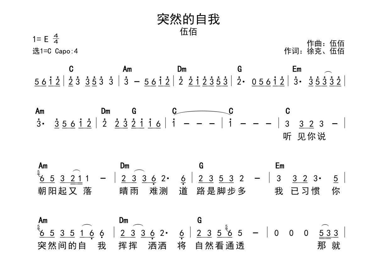 《突然的自我》是伍佰演唱的一首歌曲,带和弦级数,拍号为4/4拍,这份简谱共有一张高清图谱,图谱由 @静沐暖阳 编配上传。