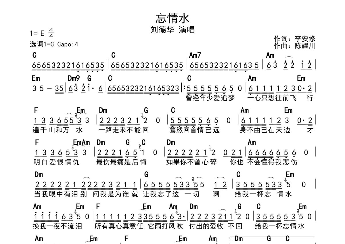 刘德华《忘情水》简谱 - 带和弦级数