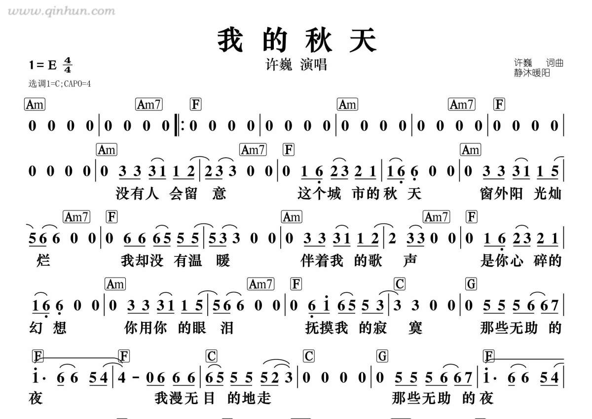 《我的秋天》是许巍演唱的一首歌曲,带和弦级数,拍号为4/4拍,这份简谱共有一张高清图谱,图谱由 @静沐暖阳 编配上传。