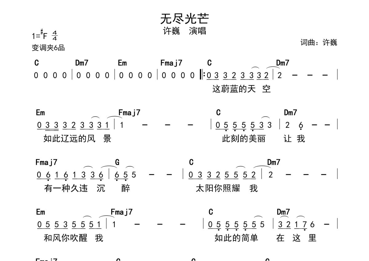 《无尽光芒》是许巍演唱的一首歌曲,带和弦级数,拍号为4/4拍,这份简谱共有一张高清图谱,图谱由 @静沐暖阳 编配上传。