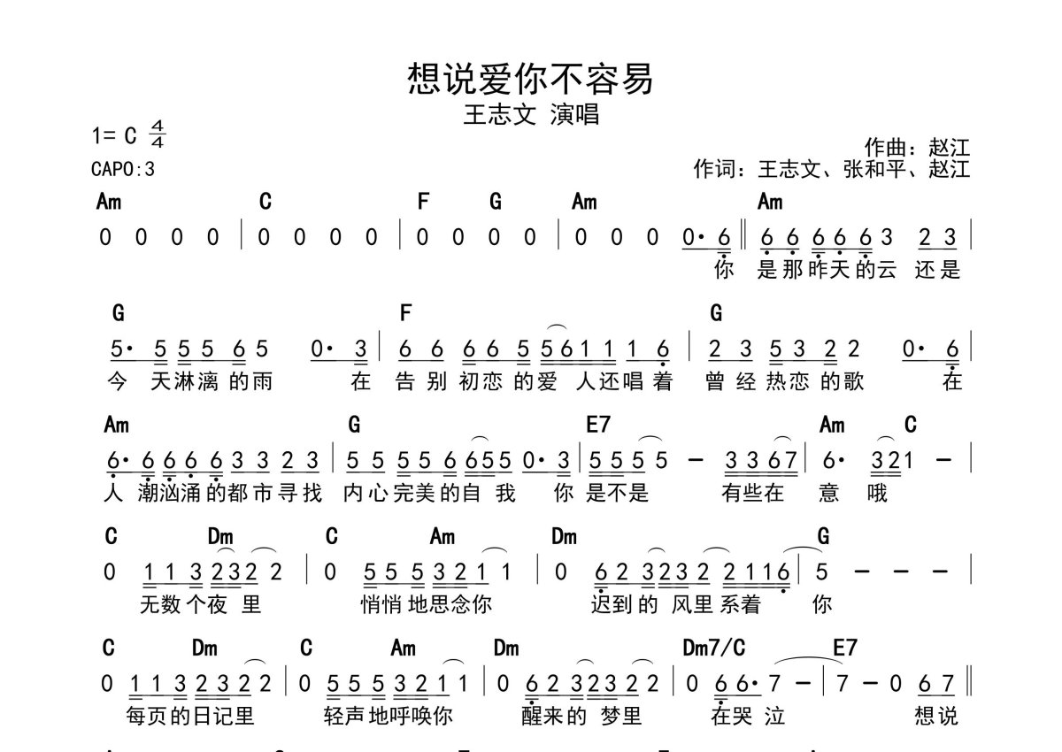《想说爱你不容易》是王志文/江珊演唱的一首歌曲,带和弦级数,拍号为4/4拍,这份简谱共有一张高清图谱,图谱由 @静沐暖阳 编配上传。