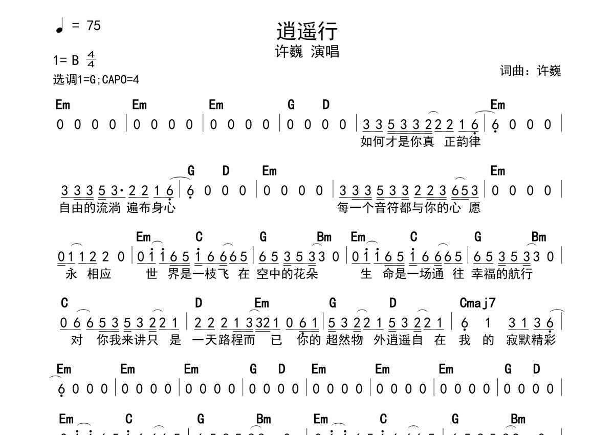 《逍遥行》是许巍演唱的一首歌曲,带和弦级数,拍号为4/4拍,歌曲速度为每分钟75拍,这份简谱共有一张高清图谱,图谱由 @静沐暖阳 编配上传。