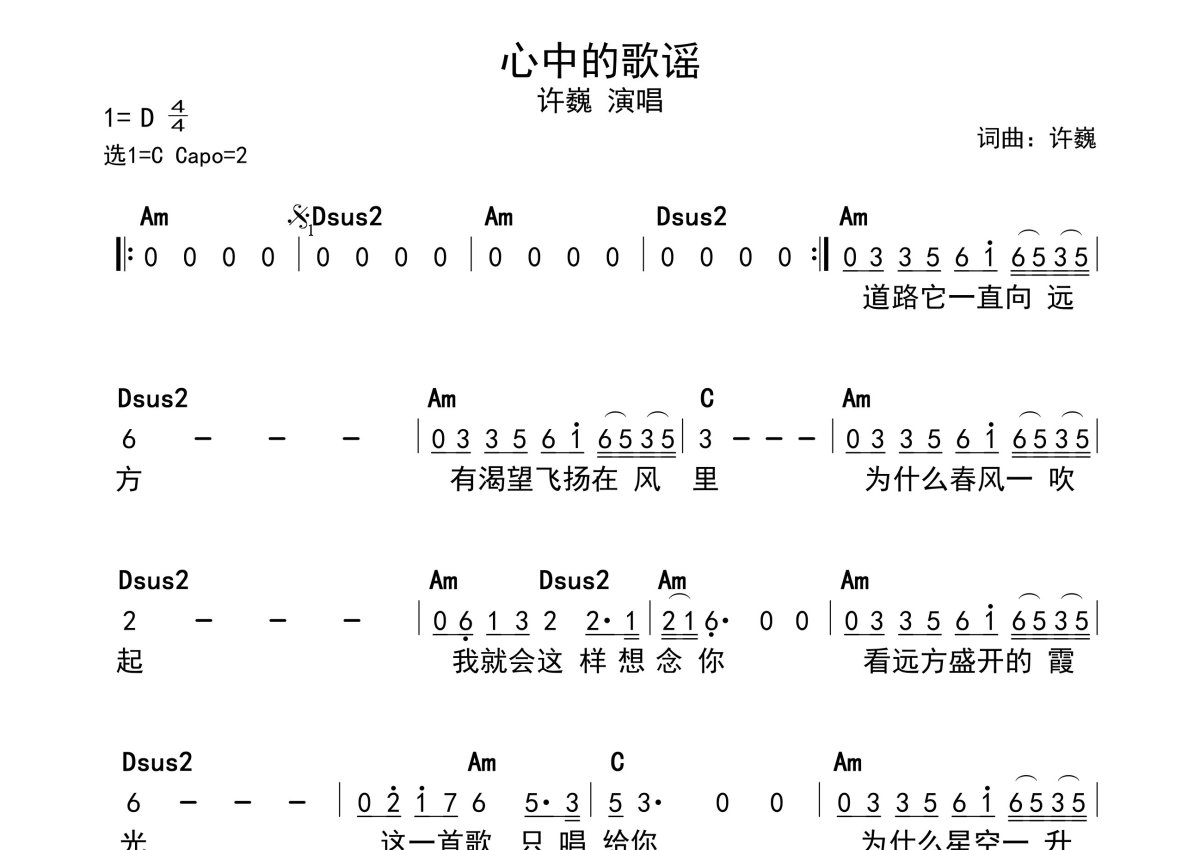 《心中的歌谣》是许巍演唱的一首歌曲,带和弦级数,拍号为4/4拍,这份简谱共有一张高清图谱,图谱由 @静沐暖阳 编配上传。