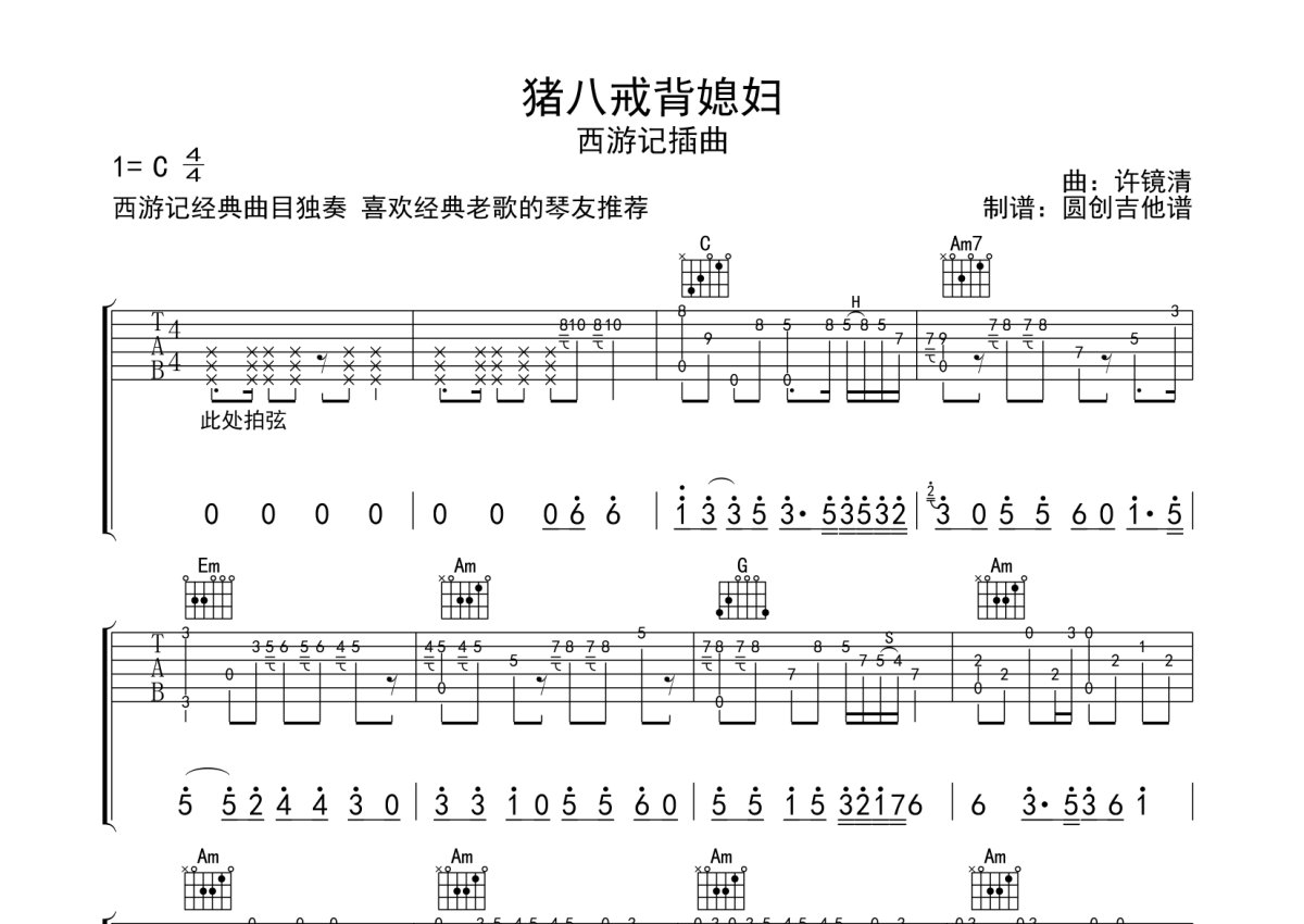许镜清《猪八戒背媳妇》吉他谱 - C调独奏六线谱