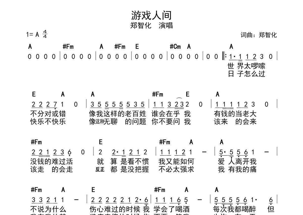 《游戏人间》是郑智化演唱的一首歌曲,带和弦级数,拍号为4/4拍,这份简谱共有一张高清图谱,图谱由 @静沐暖阳 编配上传。