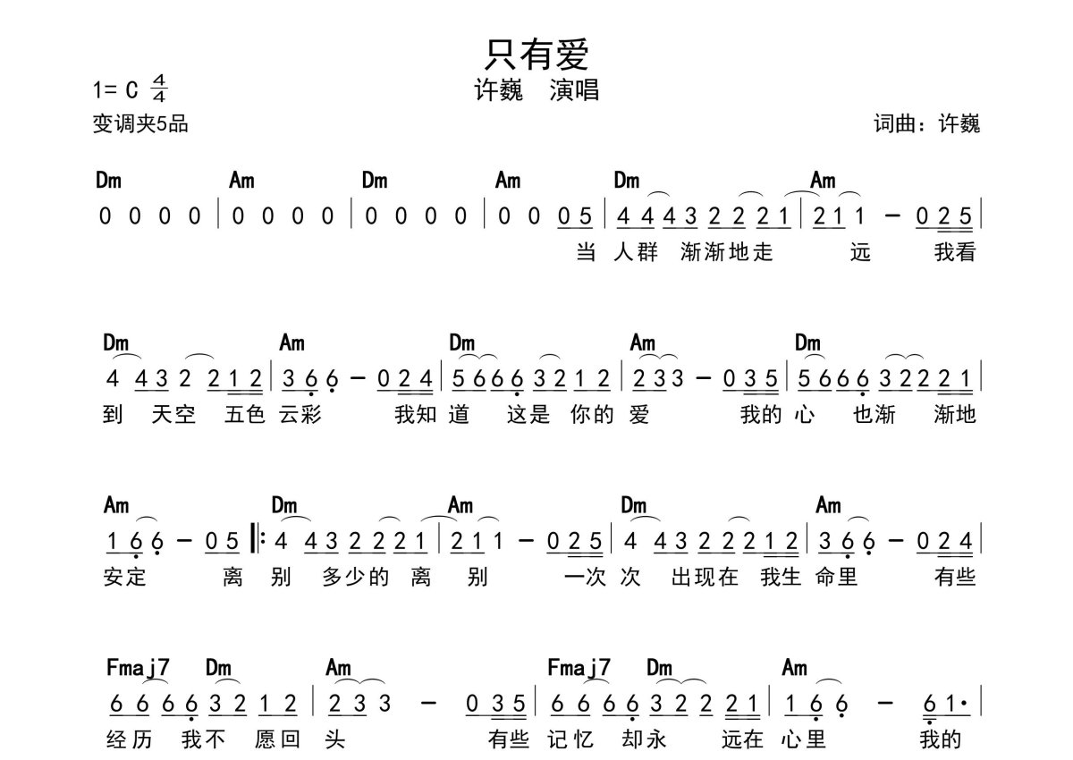 《只有爱》是许巍演唱的一首歌曲,带和弦级数,拍号为4/4拍,这份简谱共有一张高清图谱,图谱由 @静沐暖阳 编配上传。