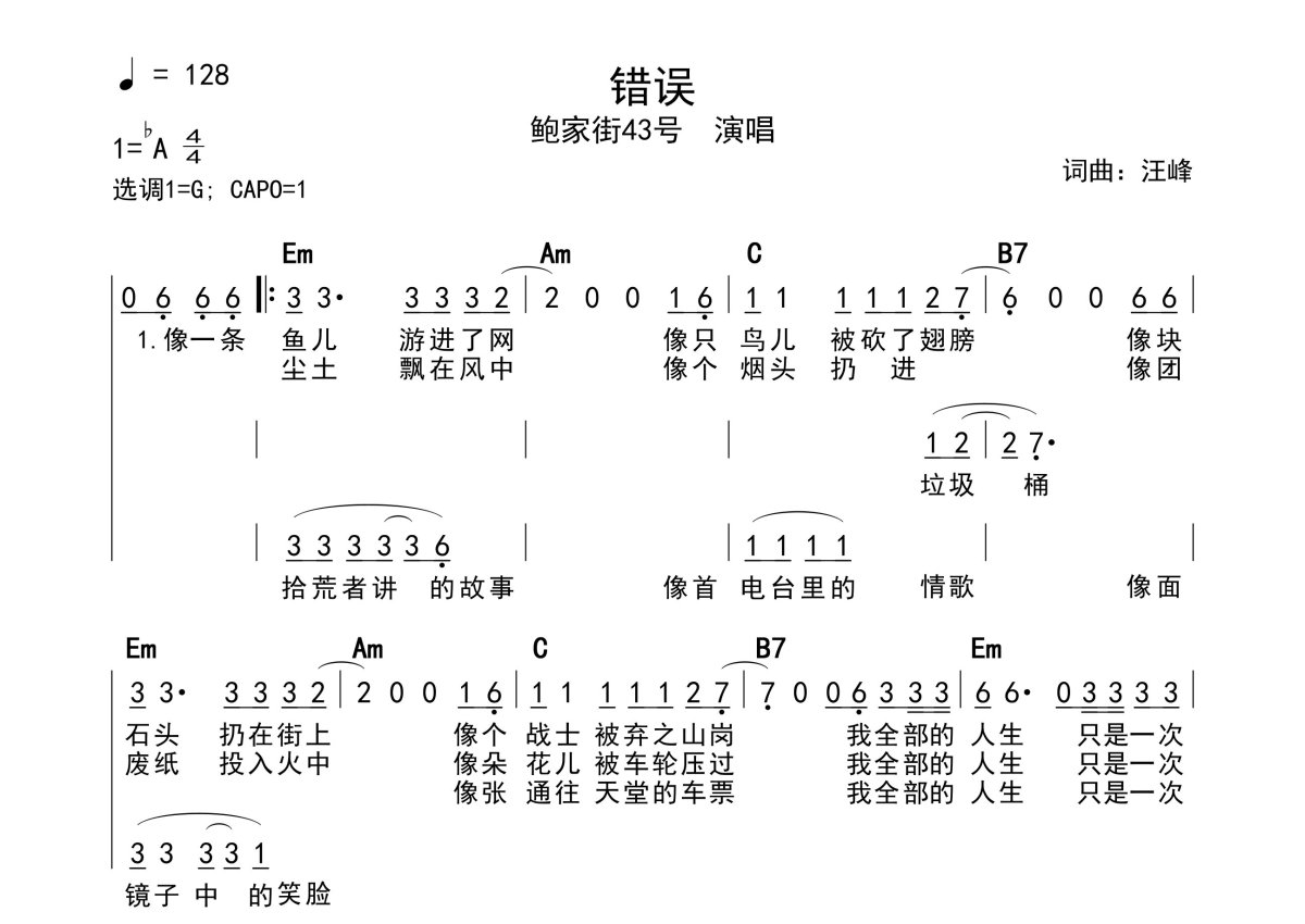《错误》是汪峰演唱的一首歌曲,带和弦级数,拍号为4/4拍,歌曲速度为每分钟128拍,这份简谱共有一张高清图谱,图谱由 @静沐暖阳 编配上传。