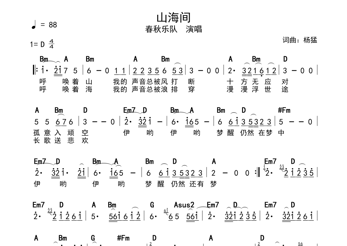 《山海间》是春秋乐队演唱的一首歌曲,带和弦级数,拍号为4/4拍,歌曲速度为每分钟88拍,这份简谱共有一张高清图谱,图谱由 @静沐暖阳 编配上传。