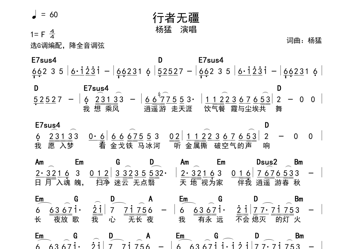 《行者无疆》是杨猛演唱的一首歌曲,带和弦级数,拍号为4/4拍,歌曲速度为每分钟60拍,这份简谱共有一张高清图谱,图谱由 @静沐暖阳 编配上传。