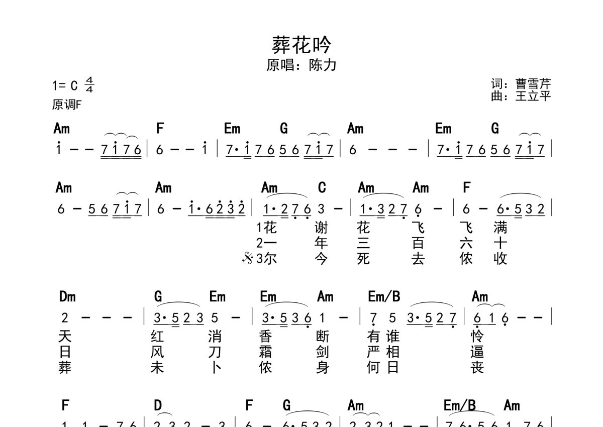 《葬花吟》是陈力演唱的一首歌曲,带和弦级数,拍号为4/4拍,这份简谱共有两张高清图谱,图谱由 @静沐暖阳 编配上传。