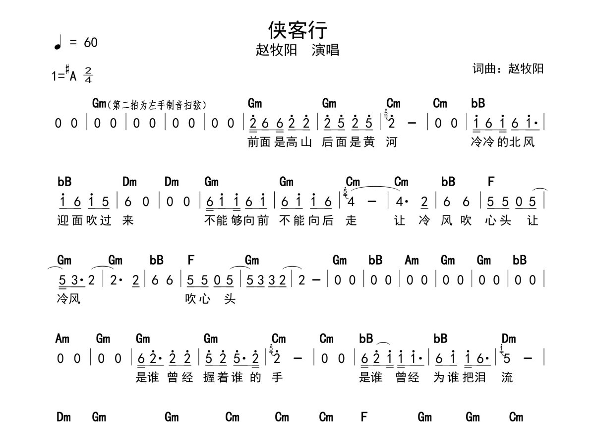 《侠客行》是赵牧阳演唱的一首歌曲,带和弦级数,拍号为2/4拍,歌曲速度为每分钟60拍,这份简谱共有一张高清图谱,图谱由 @静沐暖阳 编配上传。