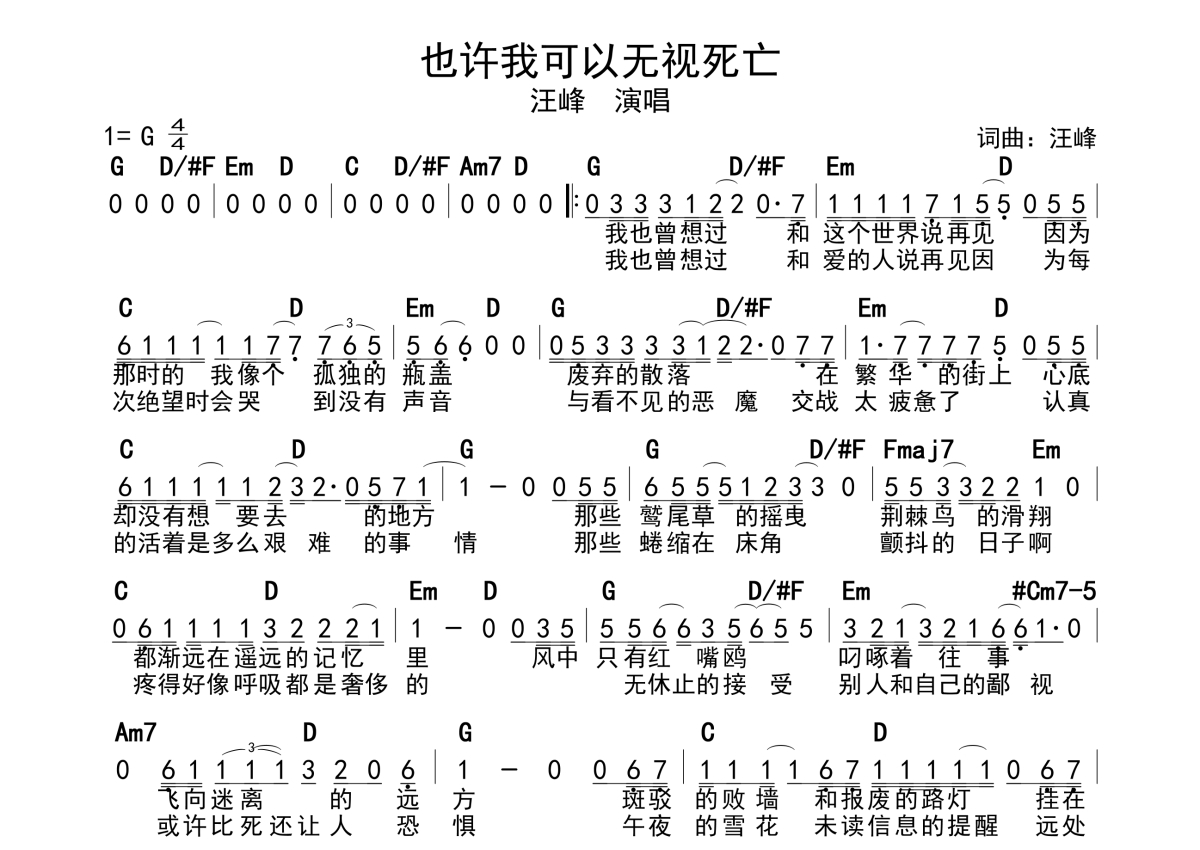 《也许我可以无视死亡》是汪峰演唱的一首歌曲,带和弦级数,拍号为4/4拍,这份简谱共有一张高清图谱,图谱由 @静沐暖阳 编配上传。