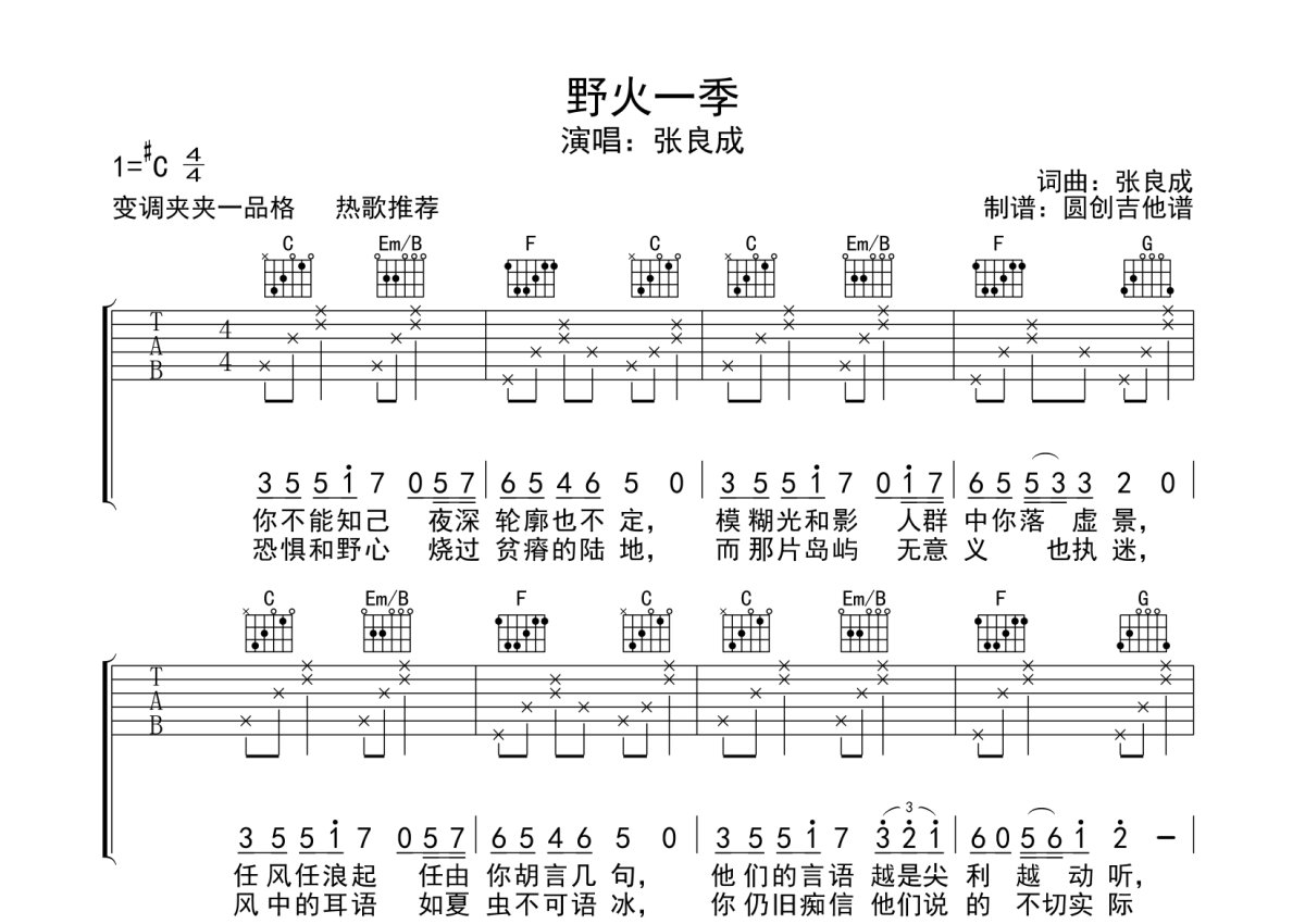 张良成《野火一季》吉他谱 - C调弹唱六线谱