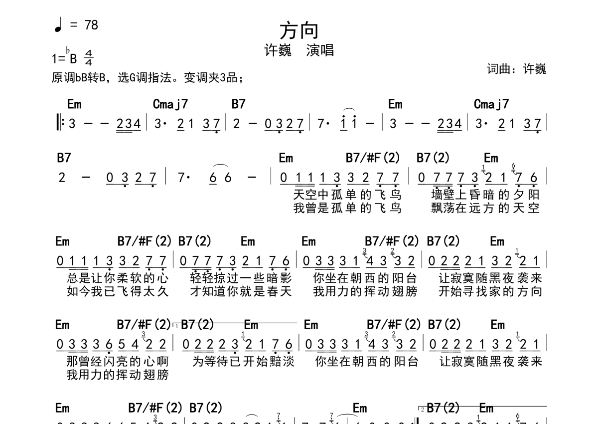 许巍《方向》简谱 - 带和弦级数