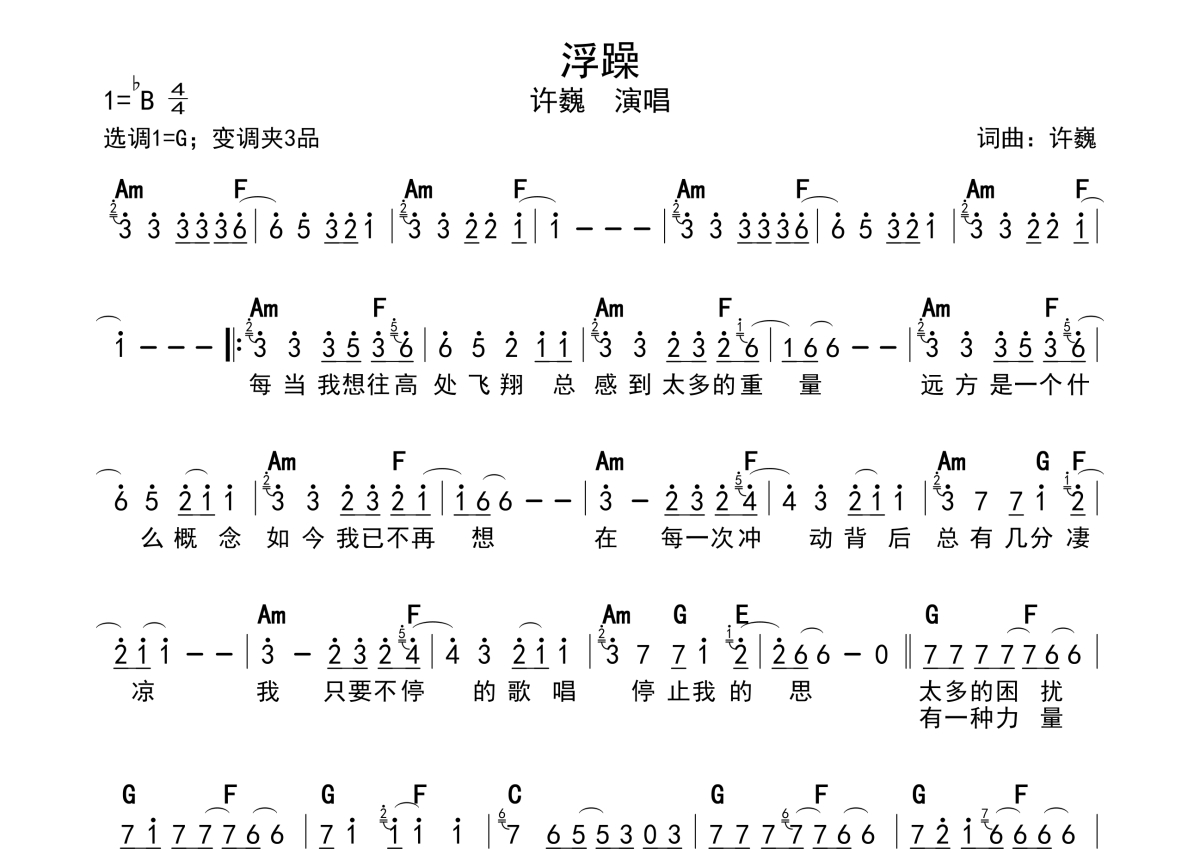 《浮躁》是许巍演唱的一首歌曲,带和弦级数,拍号为4/4拍,这份简谱共有一张高清图谱,图谱由 @静沐暖阳 编配上传。
