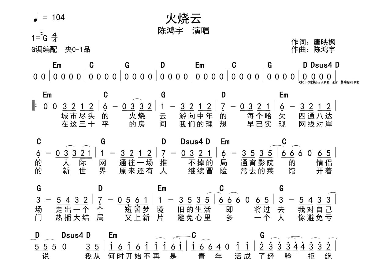 《火烧云》是陈鸿宇演唱的一首歌曲,带和弦级数,拍号为4/4拍,歌曲速度为每分钟104拍,这份简谱共有一张高清图谱,图谱由 @静沐暖阳 编配上传。