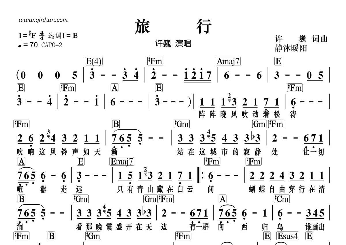 《旅行》是许巍演唱的一首歌曲,带和弦级数,拍号为4/4拍,这份简谱共有一张高清图谱,图谱由 @静沐暖阳 编配上传。
