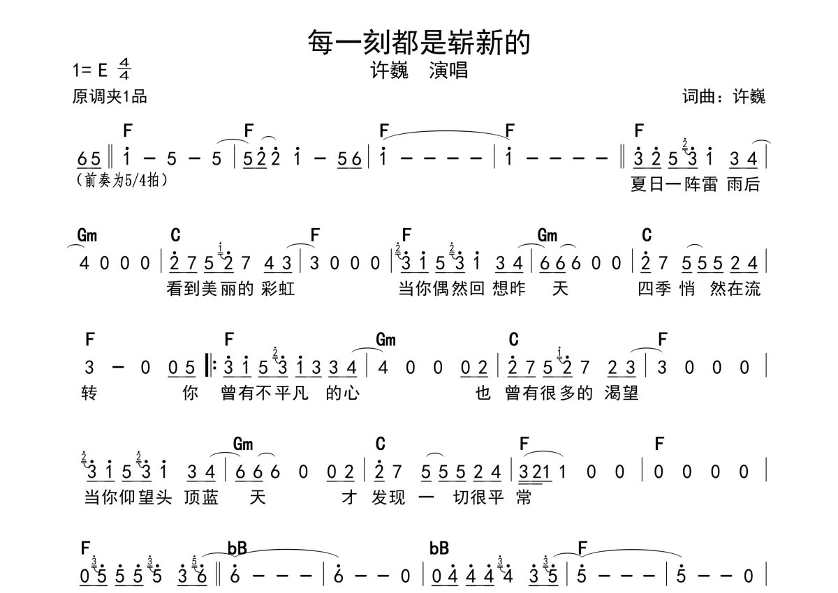 《每一刻都是崭新的》是许巍演唱的一首歌曲,带和弦级数,拍号为4/4拍,这份简谱共有一张高清图谱,图谱由 @静沐暖阳 编配上传。