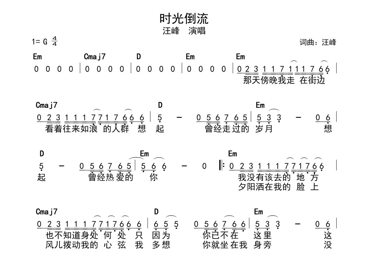 《时光倒流》是汪峰演唱的一首歌曲,带和弦级数,拍号为4/4拍,这份简谱共有一张高清图谱,图谱由 @静沐暖阳 编配上传。