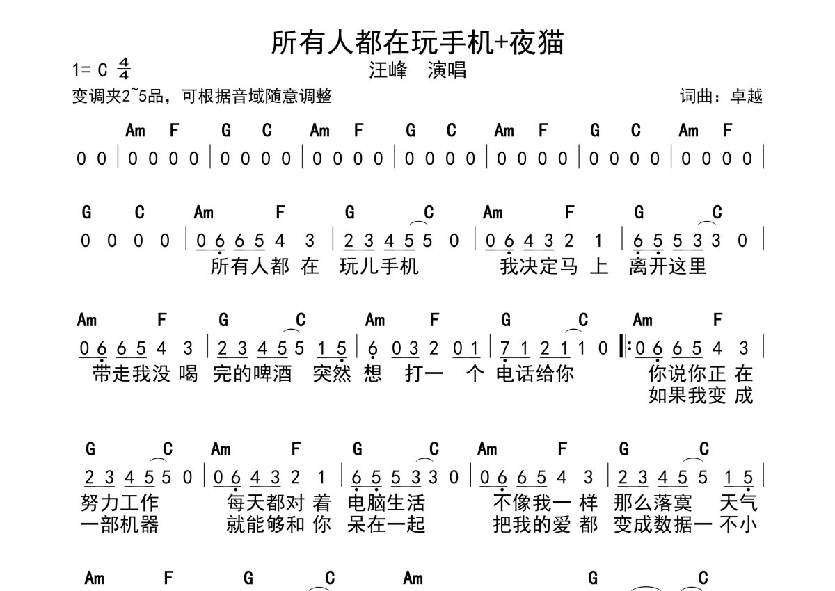 《所有人都在玩手机+夜猫》是汪峰演唱的一首歌曲,带和弦级数,拍号为4/4拍,这份简谱共有两张高清图谱,图谱由 @静沐暖阳 编配上传。