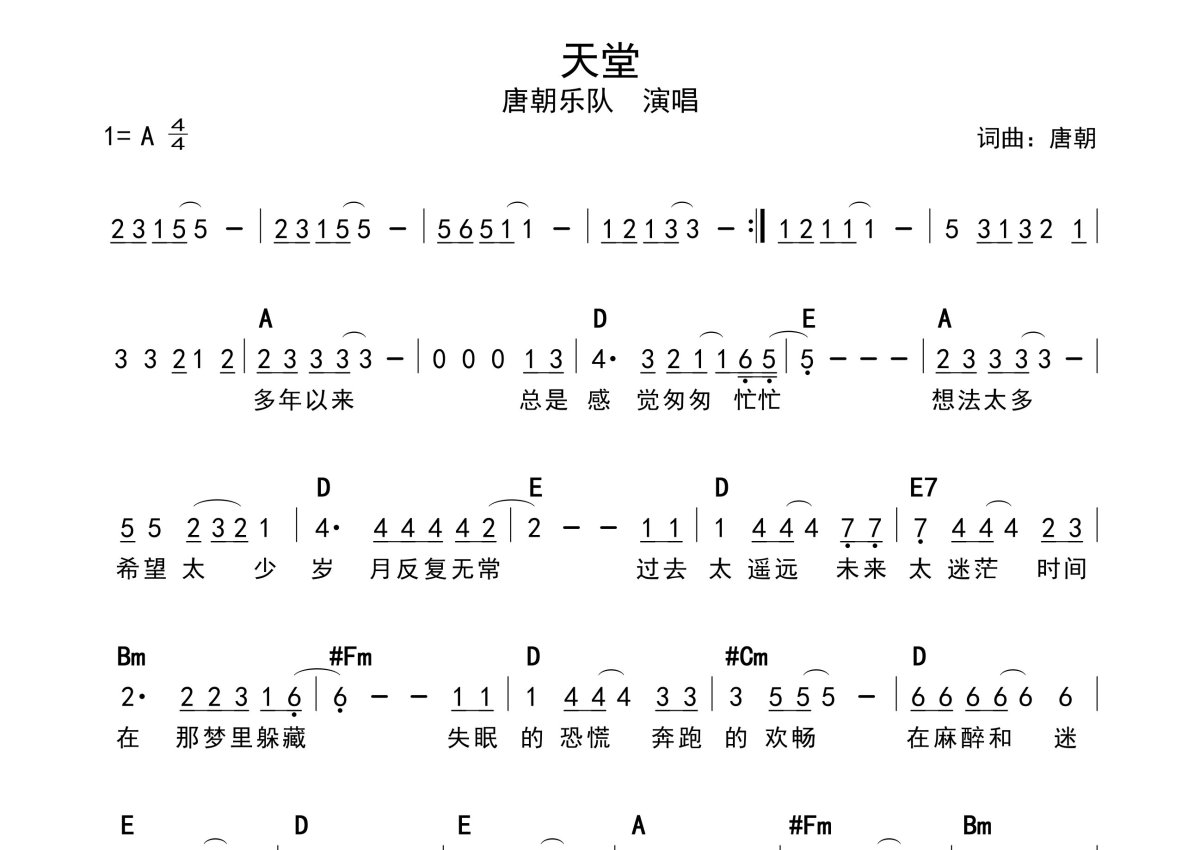 唐朝乐队《天堂》简谱 - 带和弦级数