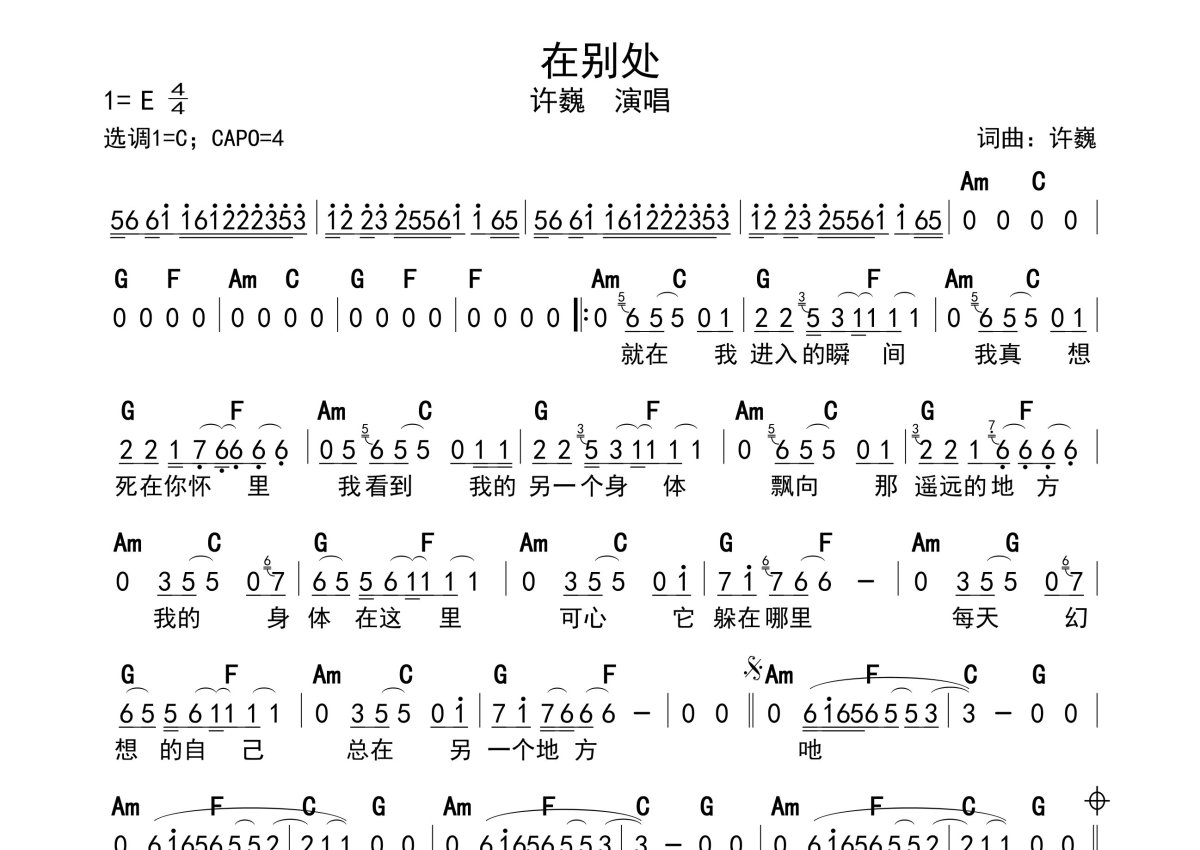 许巍《在别处》简谱 - 带和弦级数