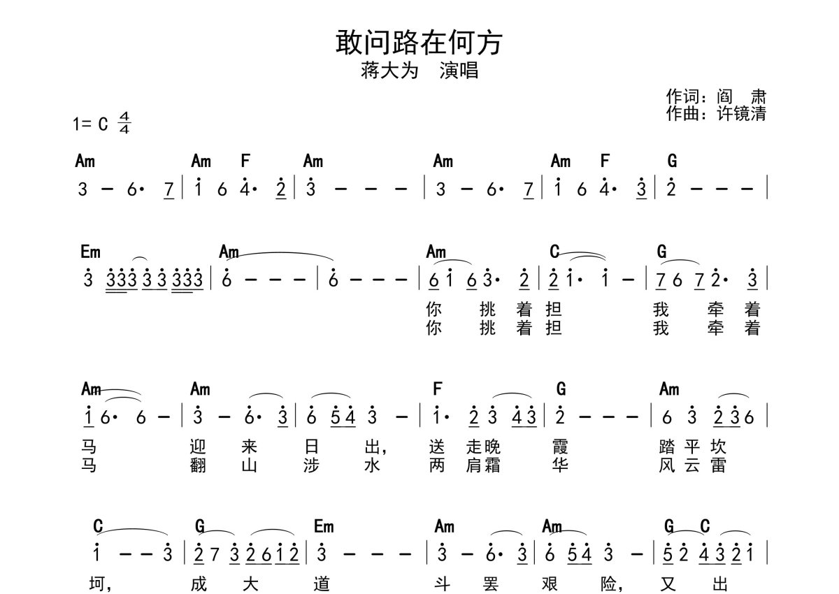 蒋大为《敢问路在何方》简谱 - 带和弦级数