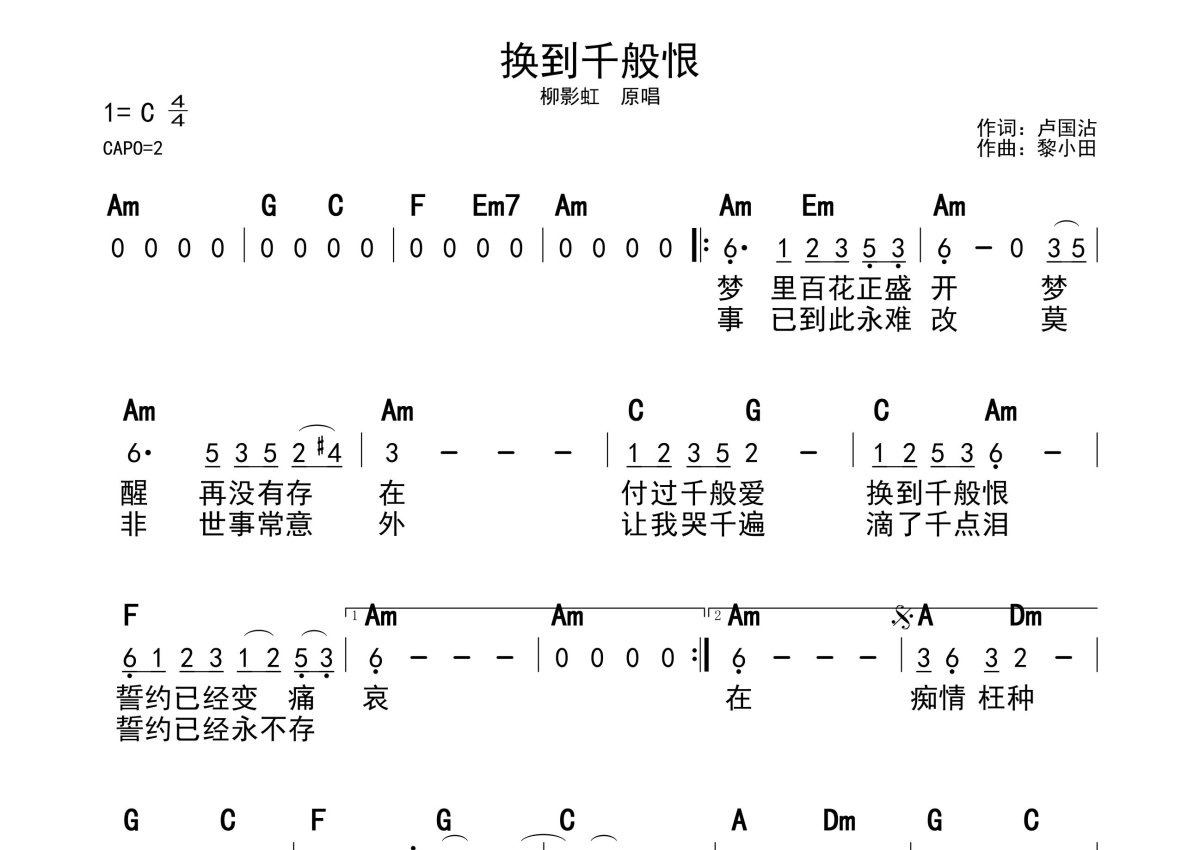 《换到千般恨》是柳影红演唱的一首歌曲,带和弦级数,拍号为4/4拍,这份简谱共有一张高清图谱,图谱由 @静沐暖阳 编配上传。