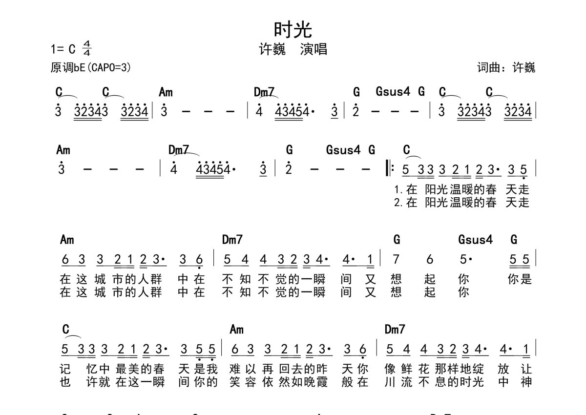 《时光》是许巍演唱的一首歌曲,带和弦级数,拍号为4/4拍,这份简谱共有一张高清图谱,图谱由 @静沐暖阳 编配上传。