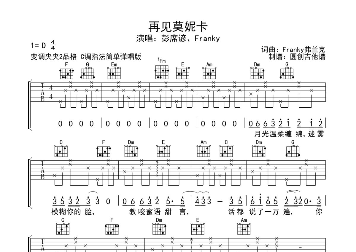 彭席谚/Franky《再见莫妮卡》吉他谱 - C调弹唱六线谱