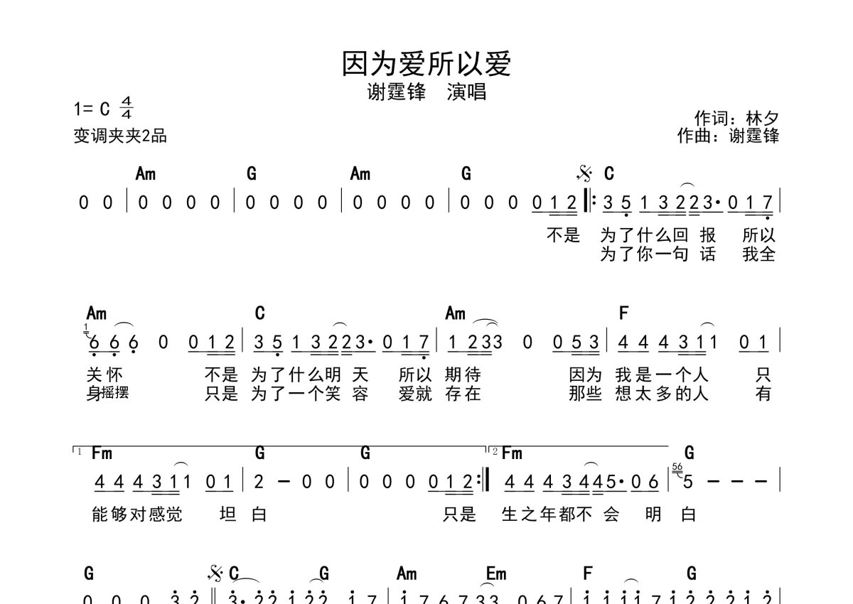 《因为爱所以爱》是谢霆锋演唱的一首歌曲,带和弦级数,拍号为4/4拍,这份简谱共有一张高清图谱,图谱由 @静沐暖阳 编配上传。