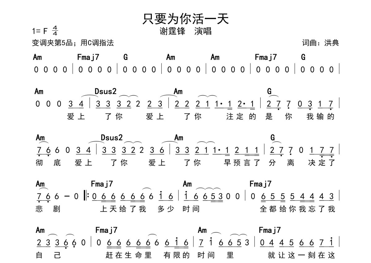 《只要为你活一天》是谢霆锋演唱的一首歌曲,带和弦级数,拍号为4/4拍,这份简谱共有一张高清图谱,图谱由 @静沐暖阳 编配上传。