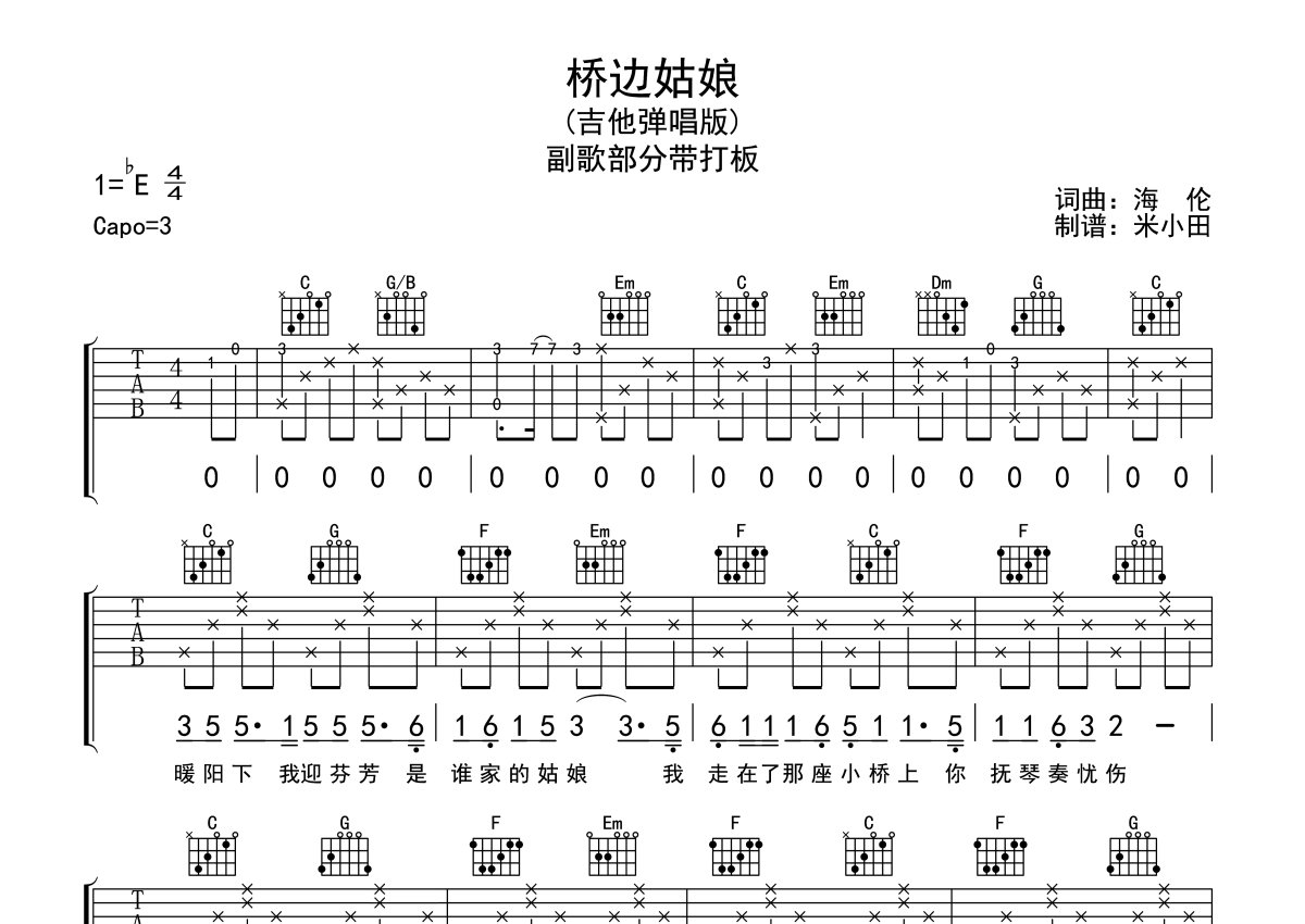 《桥边姑娘》是海伦演唱的一首歌曲,副歌带打板,本吉他谱采用的是C调指法编配,这份吉他谱共有两张高清图谱,图谱由 @米小田 编配上传,图谱使用六线谱编配,包含吉他和弦指法、简谱以及歌词部分,使用这份桥边姑娘吉他谱,可以让你更加方便地掌握这首歌曲的弹唱技巧,快来尝试吧。海伦《桥边姑娘》吉他谱_C调吉他弹唱谱_副歌带打板。