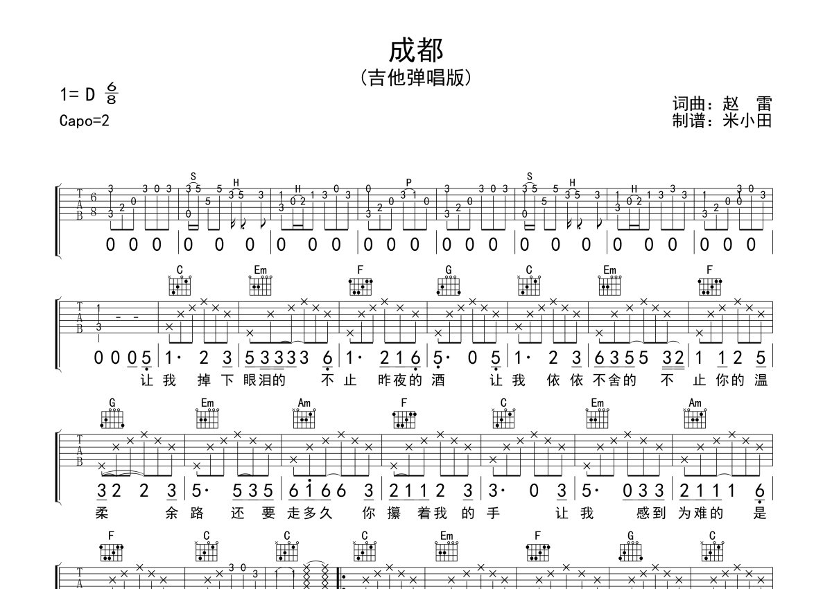 赵雷《成都》吉他谱 - C调弹唱六线谱