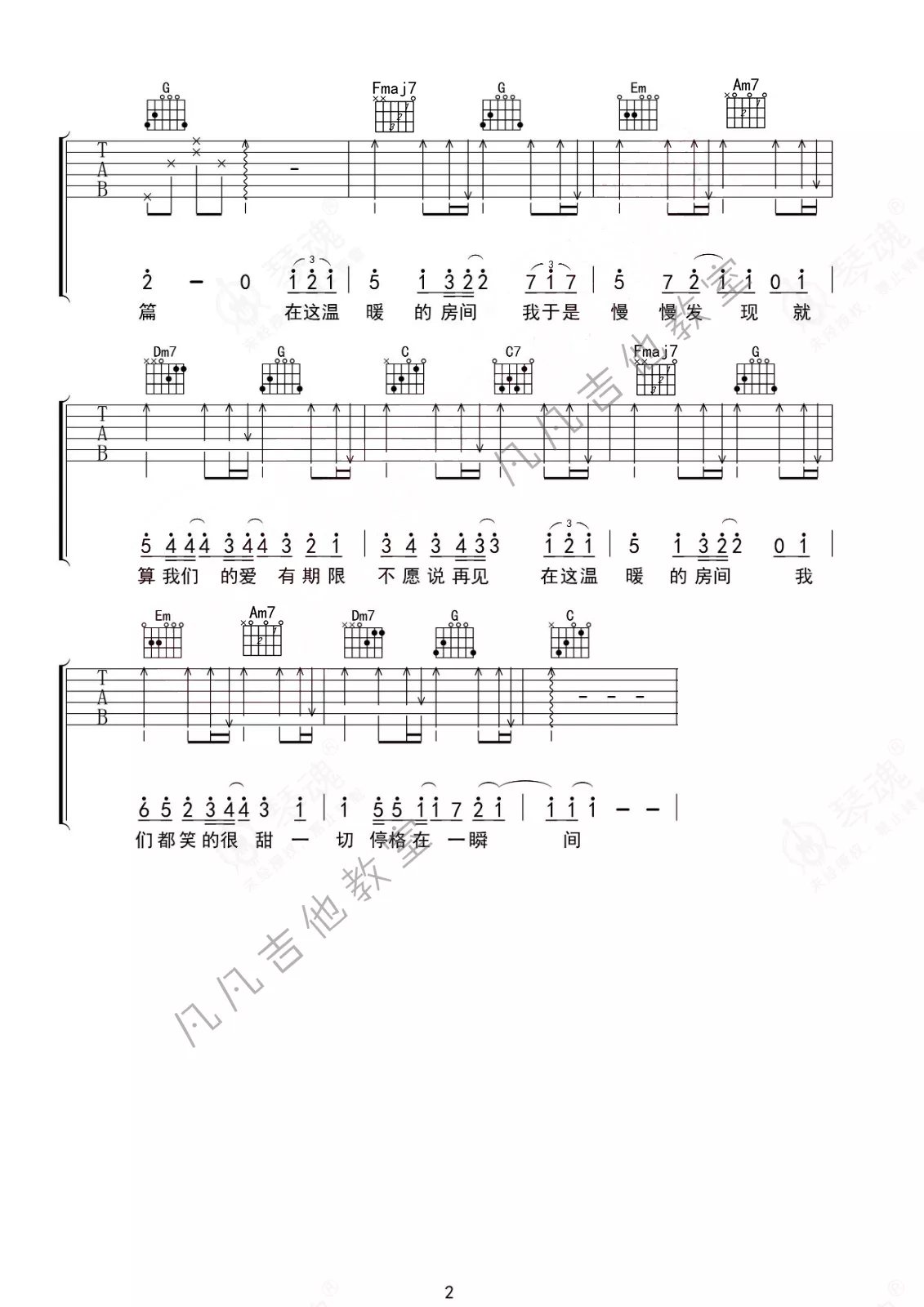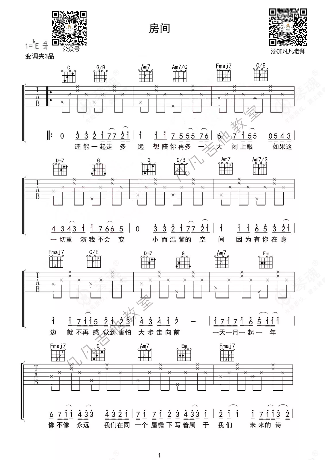《房间》是刘瑞琦演唱的一首歌曲,简单版,本吉他谱采用的是C调指法编配,这份吉他谱共有两张高清图谱,图谱由 @凡凡吉他教室 编配上传,图谱使用六线谱编配,包含吉他和弦指法、简谱以及歌词部分,曲谱配备了相关的视频提供浏览,使用这份房间吉他谱,可以让你更加方便地掌握这首歌曲的弹唱技巧,快来尝试吧。刘瑞琦《房间》吉他谱_C调吉他弹唱谱_简单版。