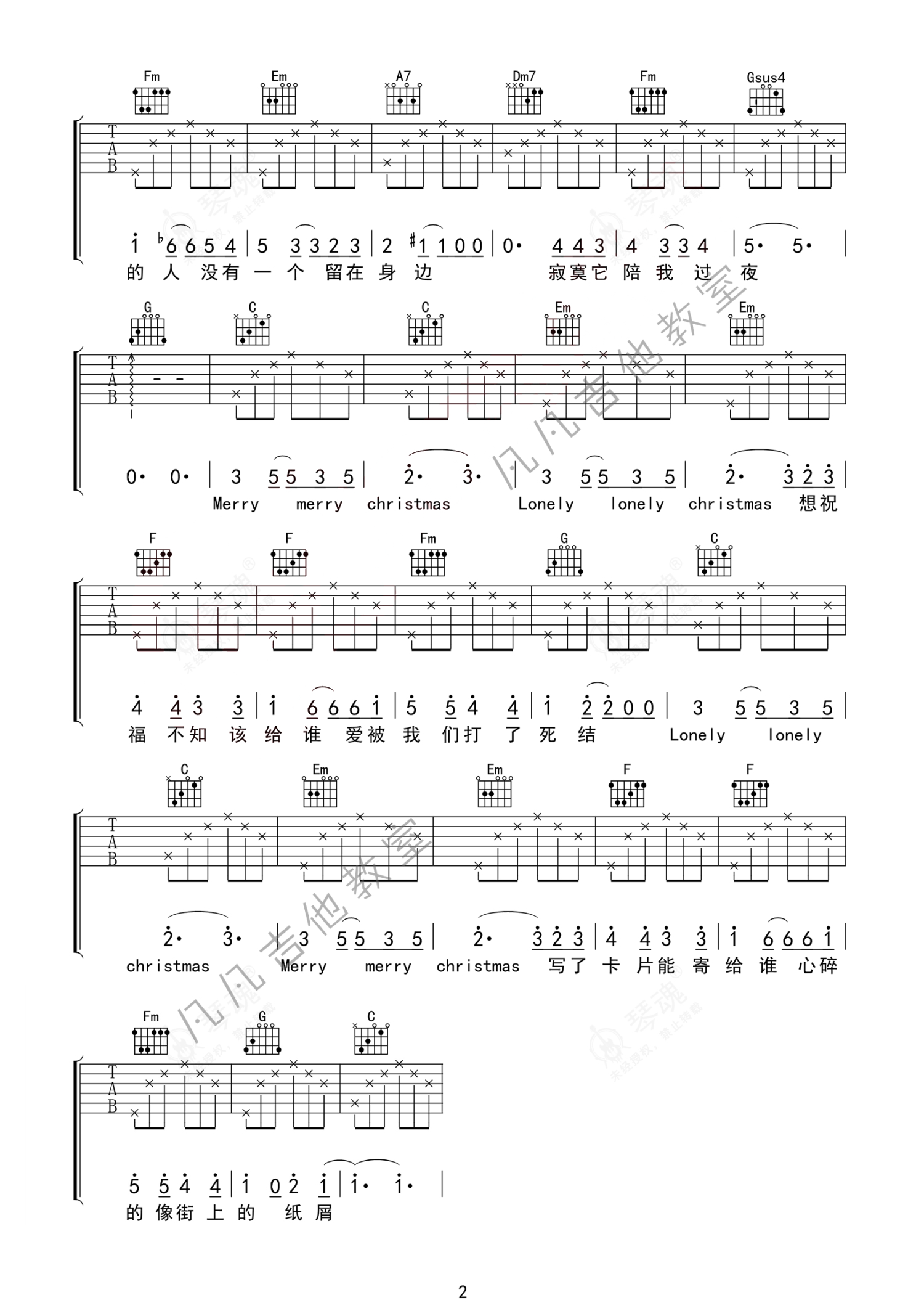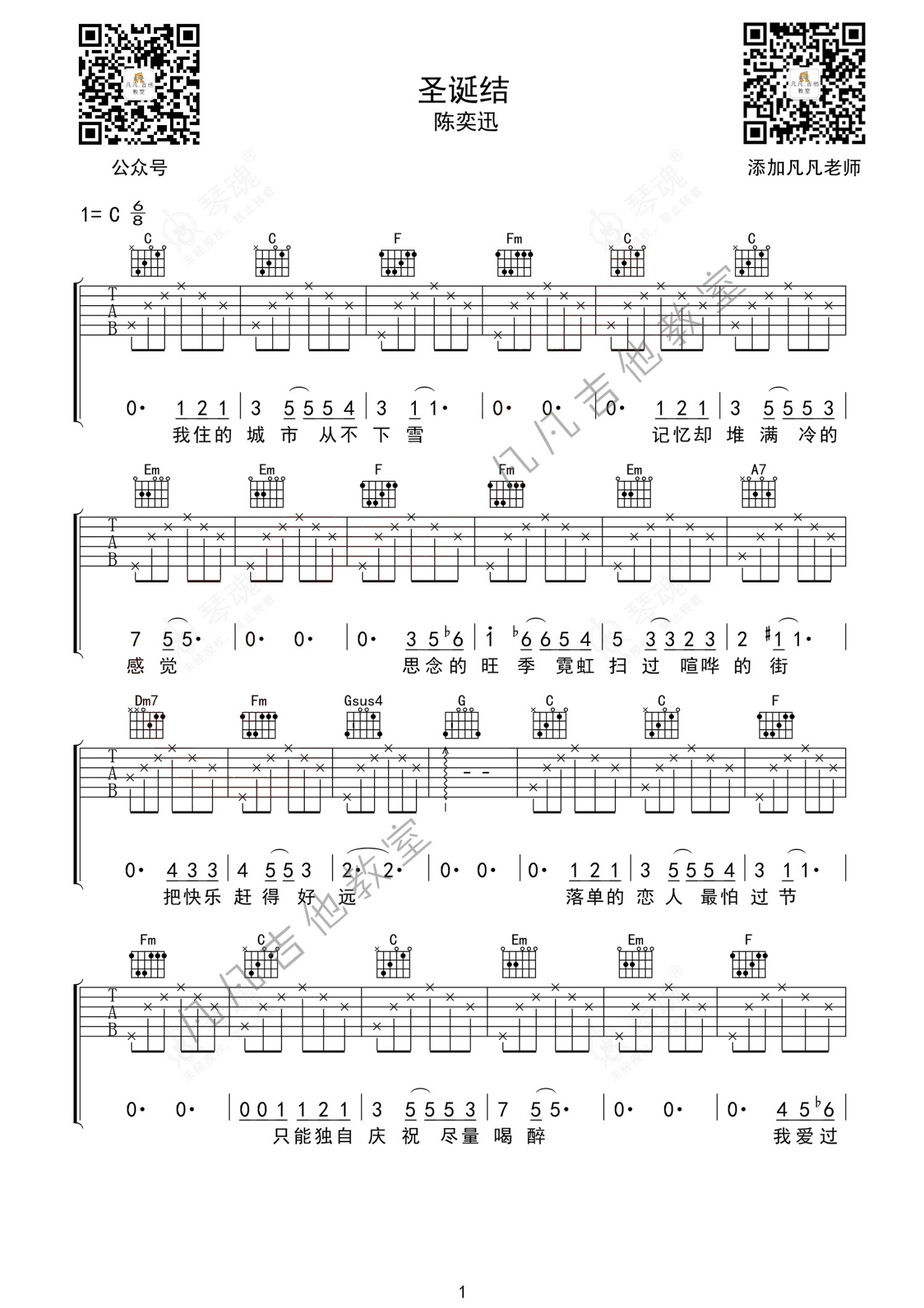 《圣诞结》是陈奕迅演唱的一首歌曲,简单版,本吉他谱采用的是C调指法编配,这份吉他谱共有两张高清图谱,图谱由 @凡凡吉他教室 编配上传,图谱使用六线谱编配,包含吉他和弦指法、简谱以及歌词部分,曲谱配备了相关的视频提供浏览,使用这份圣诞结吉他谱,可以让你更加方便地掌握这首歌曲的弹唱技巧,快来尝试吧。陈奕迅《圣诞结》吉他谱_C调吉他弹唱谱_简单版。