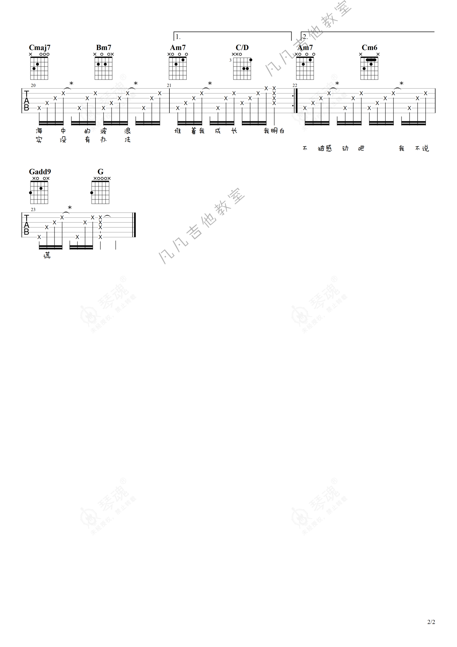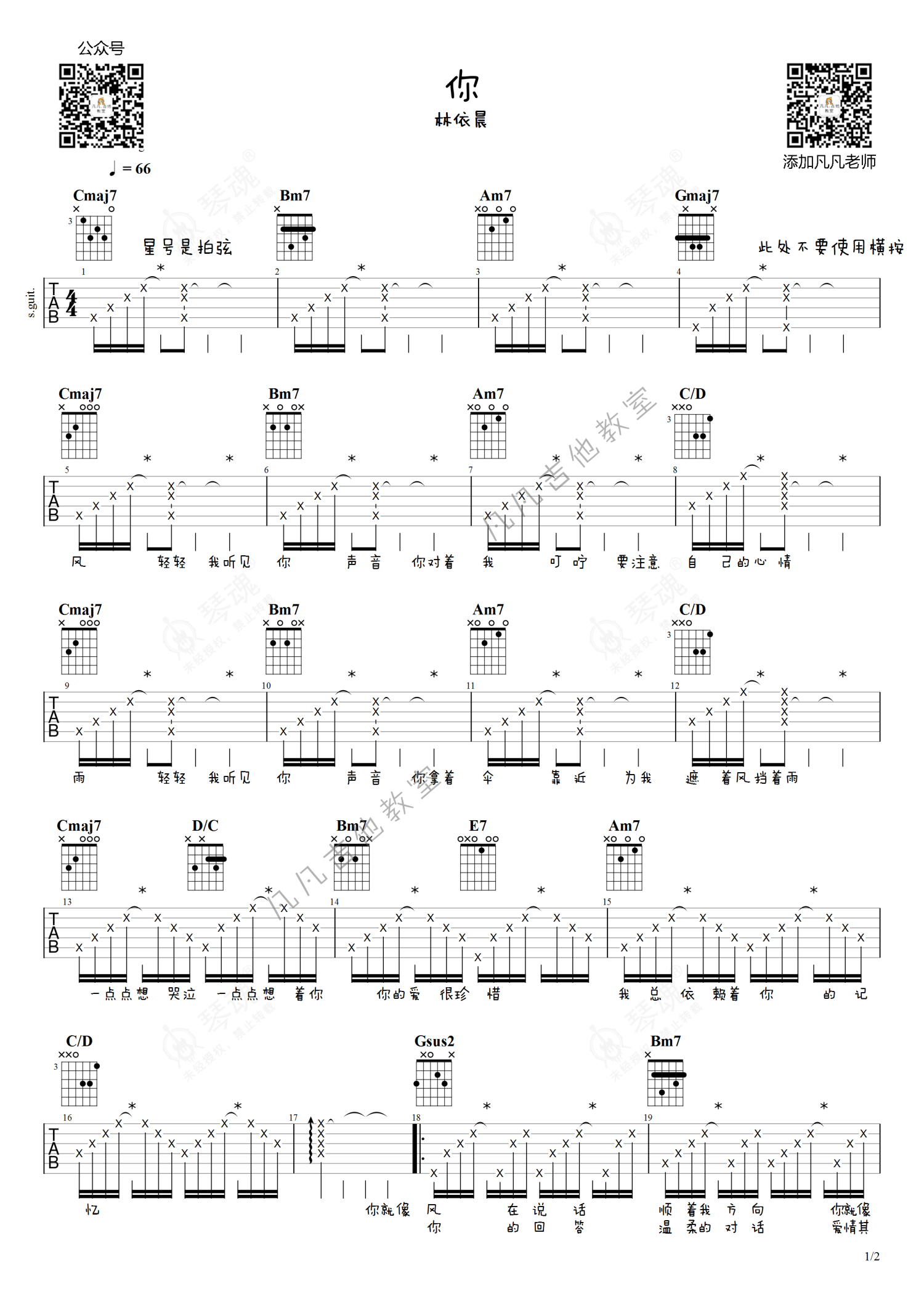 《你》是林依晨演唱的一首歌曲,简单版,本吉他谱采用的是G调指法编配,这份吉他谱共有两张高清图谱,图谱由 @凡凡吉他教室 编配上传,图谱使用六线谱编配,包含吉他和弦指法、简谱以及歌词部分,曲谱配备了相关的视频提供浏览,使用这份你吉他谱,可以让你更加方便地掌握这首歌曲的弹唱技巧,快来尝试吧。林依晨《你》吉他谱_G调吉他弹唱谱_简单版。